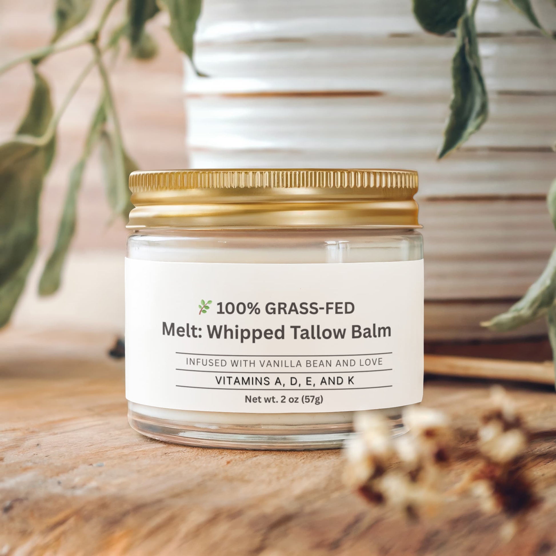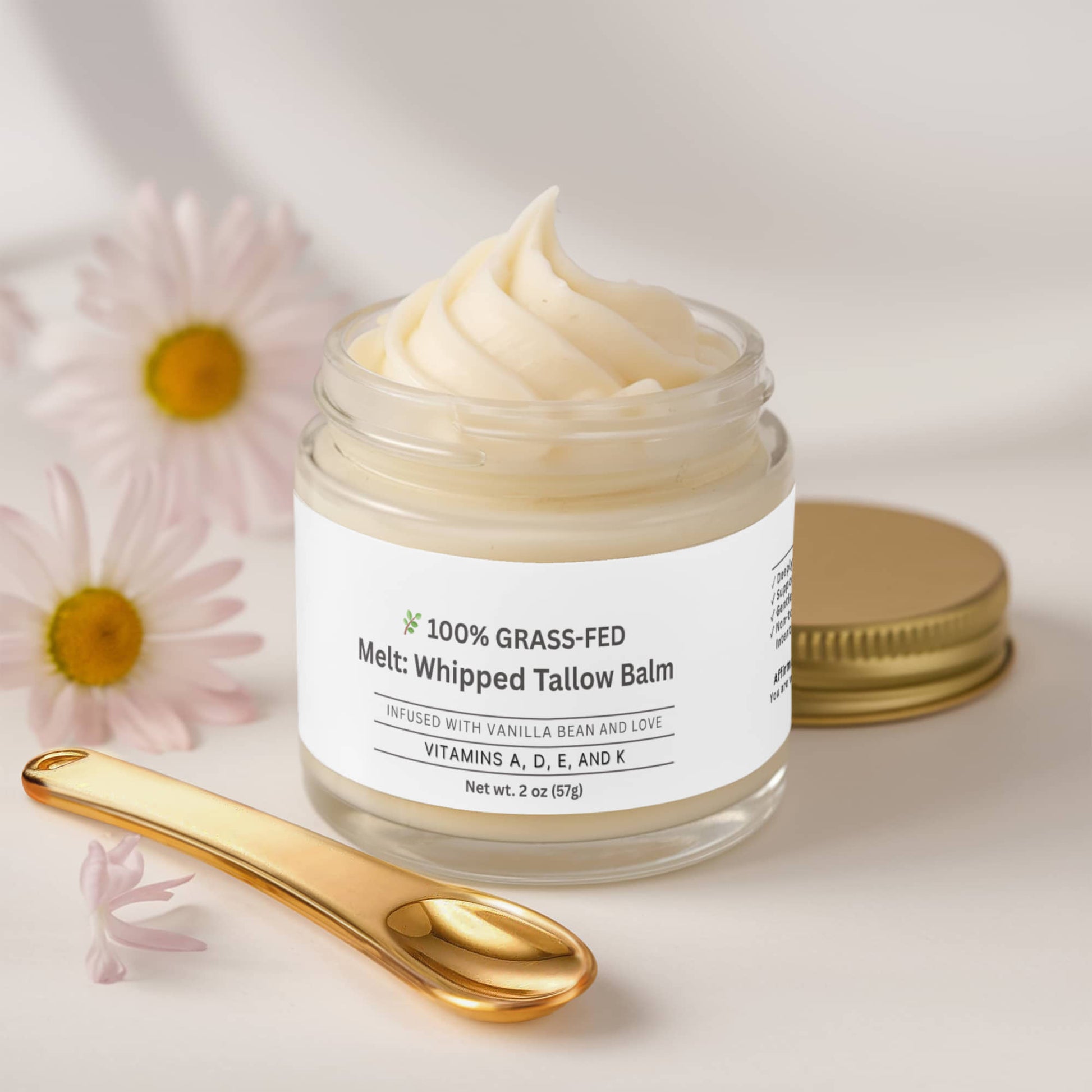 Experience deep nourishment with Melt — a luxurious whipped tallow balm made from 100% grass-fed tallow and infused with whole vanilla bean. This soul-soothing formula calms inflammation, deeply hydrates, and supports your skin’s natural regeneration — without synthetic fillers.